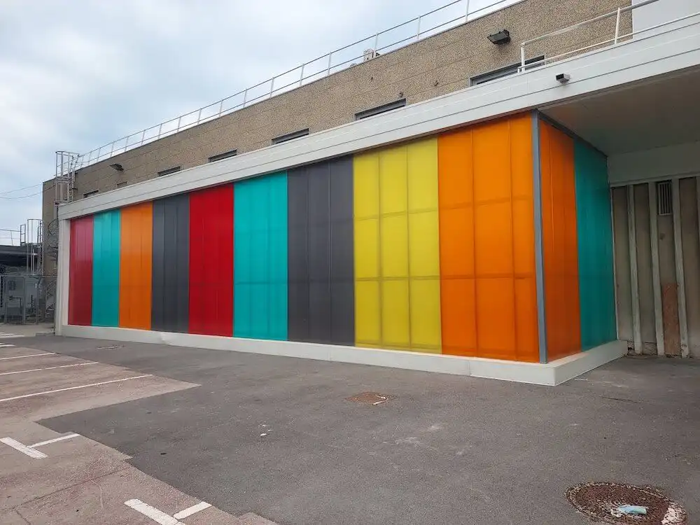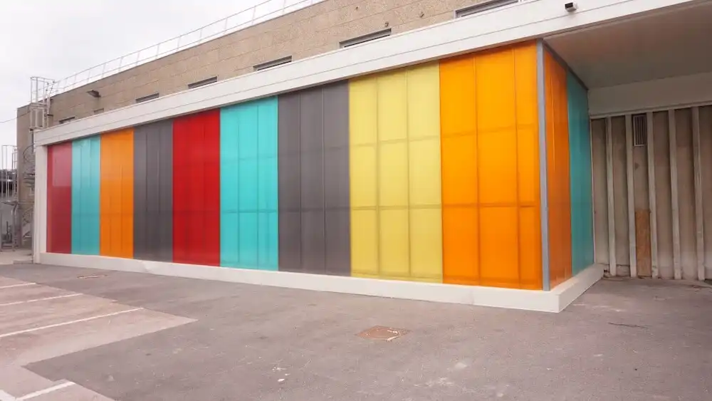Grazie alle caratteristiche di traslucidità del policarbonato e alla possibilità di realizzare lastre in qualsiasi colore, la facciata principale è stata rinnovata con un risultato finale di elevata valenza estetica.