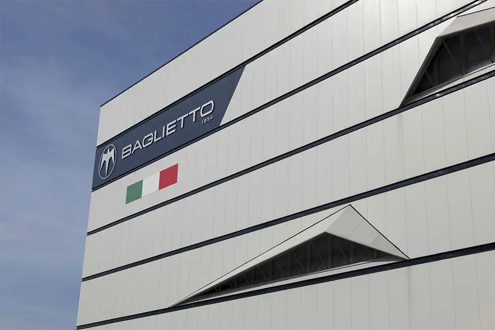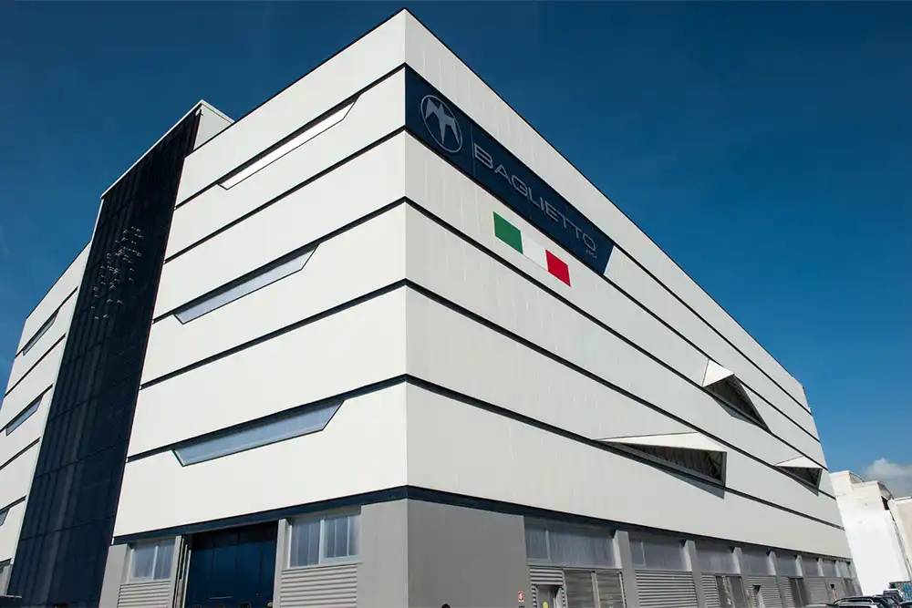 L’elevata flessibilità del sistema ha permesso di realizzare queste finestrature tramite tagli nella facciata, con una forma a parallelepipedo che richiama, anche grazie alla copertura realizzata davanti ad esse, la sagoma delle ali del gabbiano stilizzato, pittogramma dello stemma della Baglietto.