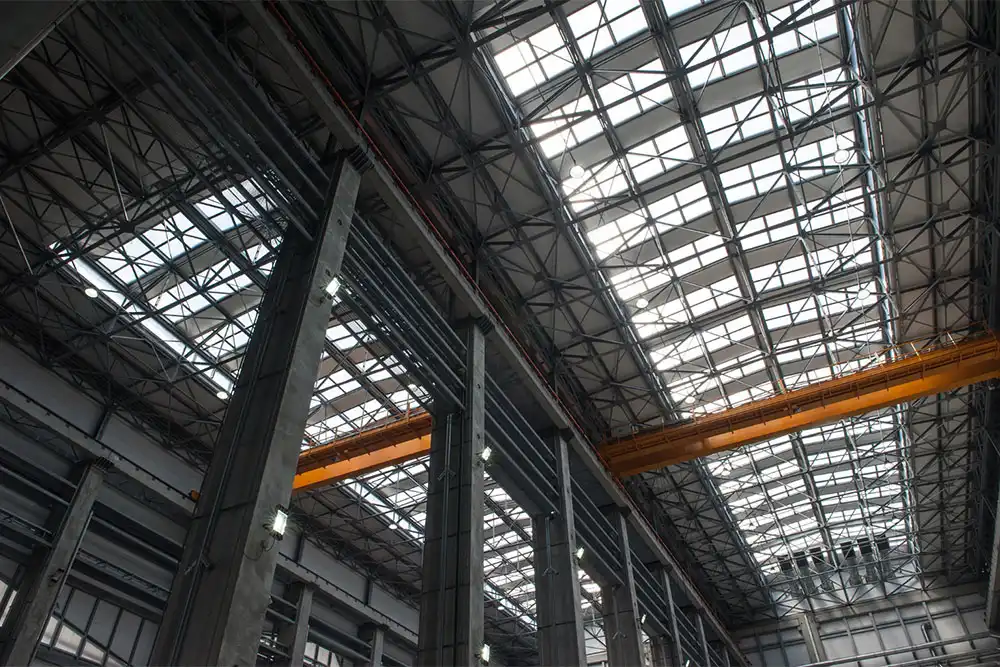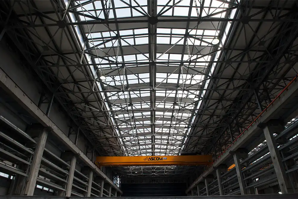 Sotto ogni lucernaio è montata una struttura di supporto realizzata con profili a omega alti 70 mm che permettono sia di supportare il policarbonato, appoggiandosi all’orditura principale che sostiene i pannelli sandwich, sia di sollevare i pannelli traslucidi, portandoli al livello di quelli ciechi.