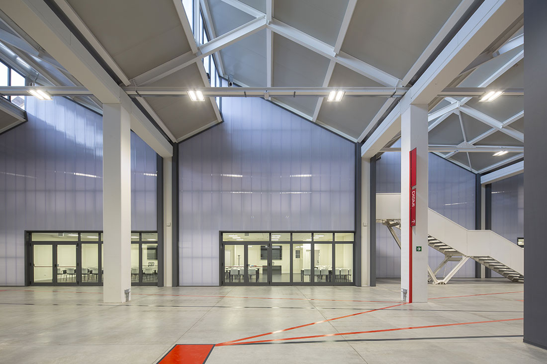 A separare la piazza dagli ambienti didattici è una doppia parete in policarbonato, realizzata con i nostri pannelli PanelPiù 500/40 5P opalino, scelti per le loro proprietà prestazionali e per l’elegante effetto satinato.